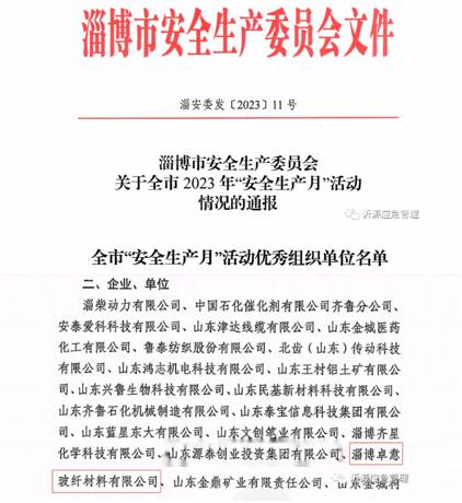 近日,淄博市安全生产委员会发布了《关于全市2023年“安全生产月”活动情况的通报》,对在“安全生产月”期间组织开展活动有力有效的部分单位和企业进行通报表扬。山东玻纤卓意公司(以下简称卓意玻纤)荣获2023年全市“安全生产月”活动优秀组织单位荣誉称号。