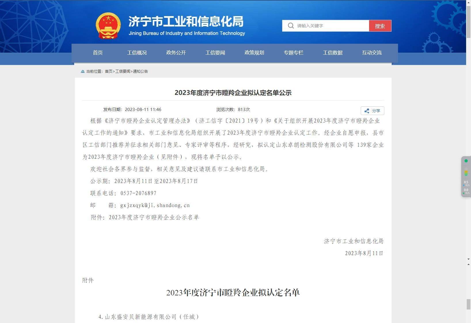 本站讯 近日,济宁市工业和信息化局发布了2023年度济宁市瞪羚企业名单,盛安贝公司凭借自身综合实力光荣登榜。