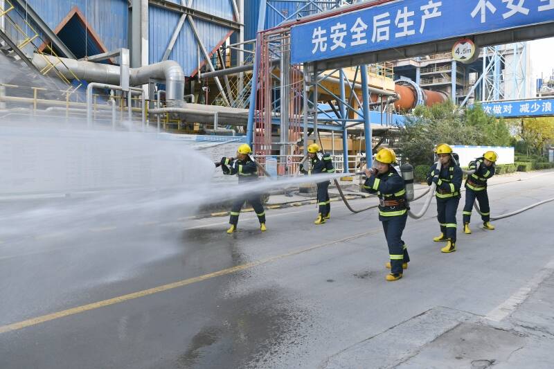 10月24日上午,东华科技煤粉制备系统前,穿着消防战斗服的应急救援队员拿着消防水带蓄势待发,一场火灾爆炸专项应急演练正在进行。