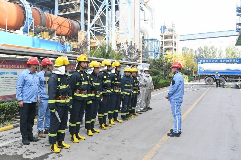 与此同时,在生产现场,马伟波已经请示了值班调度人员和煤粉制备所在的烧成车间负责人,并立即疏散人员,迅速采取紧急措施,组织人员拉好警戒线,防止事故扩大。两组应急救援队员兵分两路,一组着消防战斗服,拿着消防水带对高温区域进行喷洒,另一组着隔热服正在等待“火势”得到控制后进入现场。