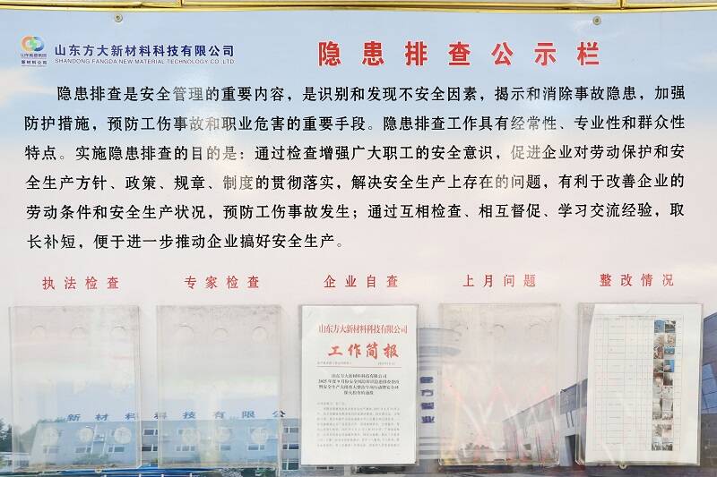 月度安全会后,该公司车间主任王朋朋便带领职工深入车间开展隐患排查行动。“刘亮带维修班组,检查办公楼和仓库。我带各班组长对生产一、二车间进行摸排,发现隐患立即在群里上报。”王朋朋说道。为保障极端天气生产,方大新材采用“地毯式排查 + 重点复查”模式,对厂区内 12 个区域进行检查,并对生产设备缝隙防冻、食堂冰柜防水等易忽略点位进行重点标注。