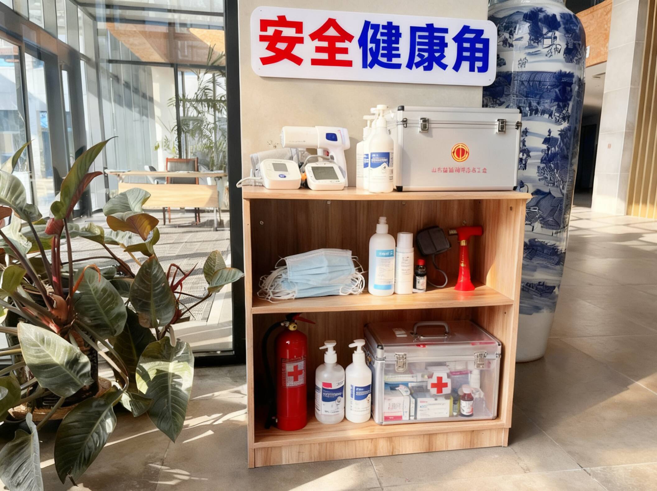 该公司还在办公区及休闲区设立健康监测角,配备测温枪、电子血压计等便携式健康检测设备,方便员工随时自查身体状态;同时建立完善的应急物资储备库,储备口罩、消毒液、消防锤等物资,以及含常用药品的应急医药箱,全方位筑牢办公环境的健康安全防线。