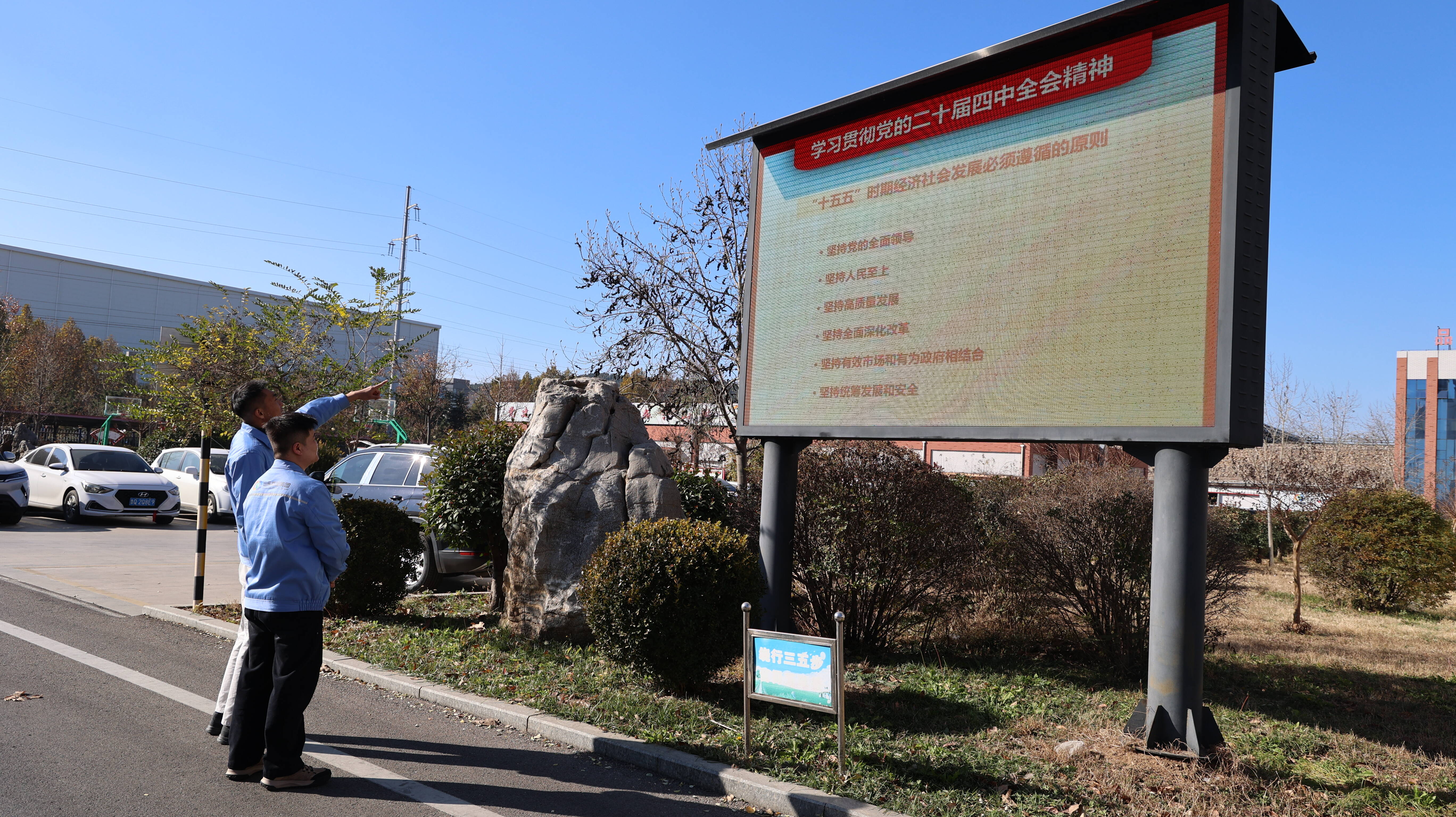 走进厂区,各生产车间、办公楼的电子屏上,“深入学习贯彻党的二十届四中全会精神”“‘十五五’时期经济社会发展的主要目标”等宣贯标语循环滚动,电子屏上,图文并茂解读全会核心要义与实践要求,让职工抬眼可见、驻足可学。