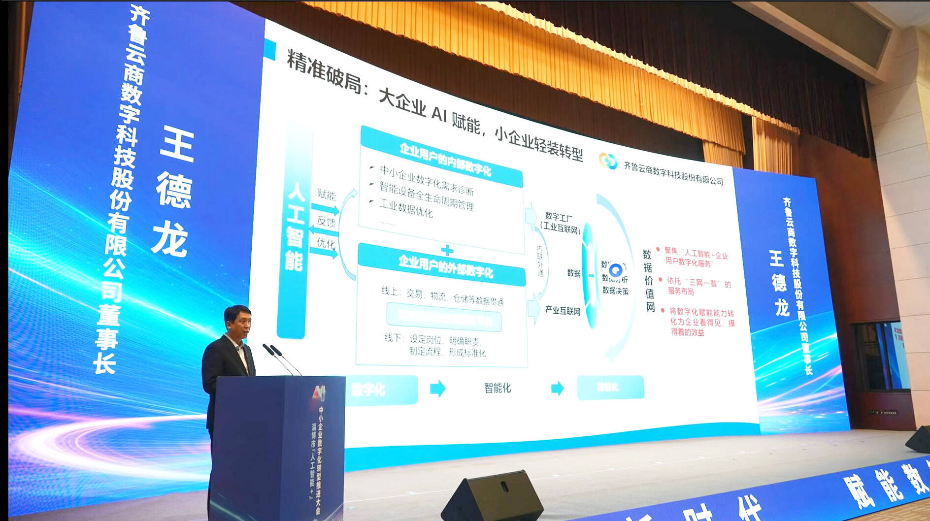 (王德龙在淄博市“人工智能+”中小企业数字化转型推进大会上做主题演讲)